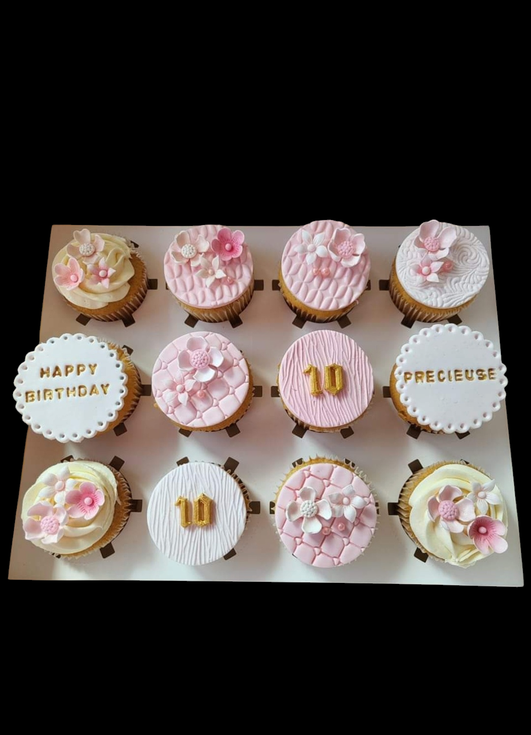 This elegant floral theme cupcake set includes 12 pcs cupcakes. Colors, number and name can be customized as per your preferences.